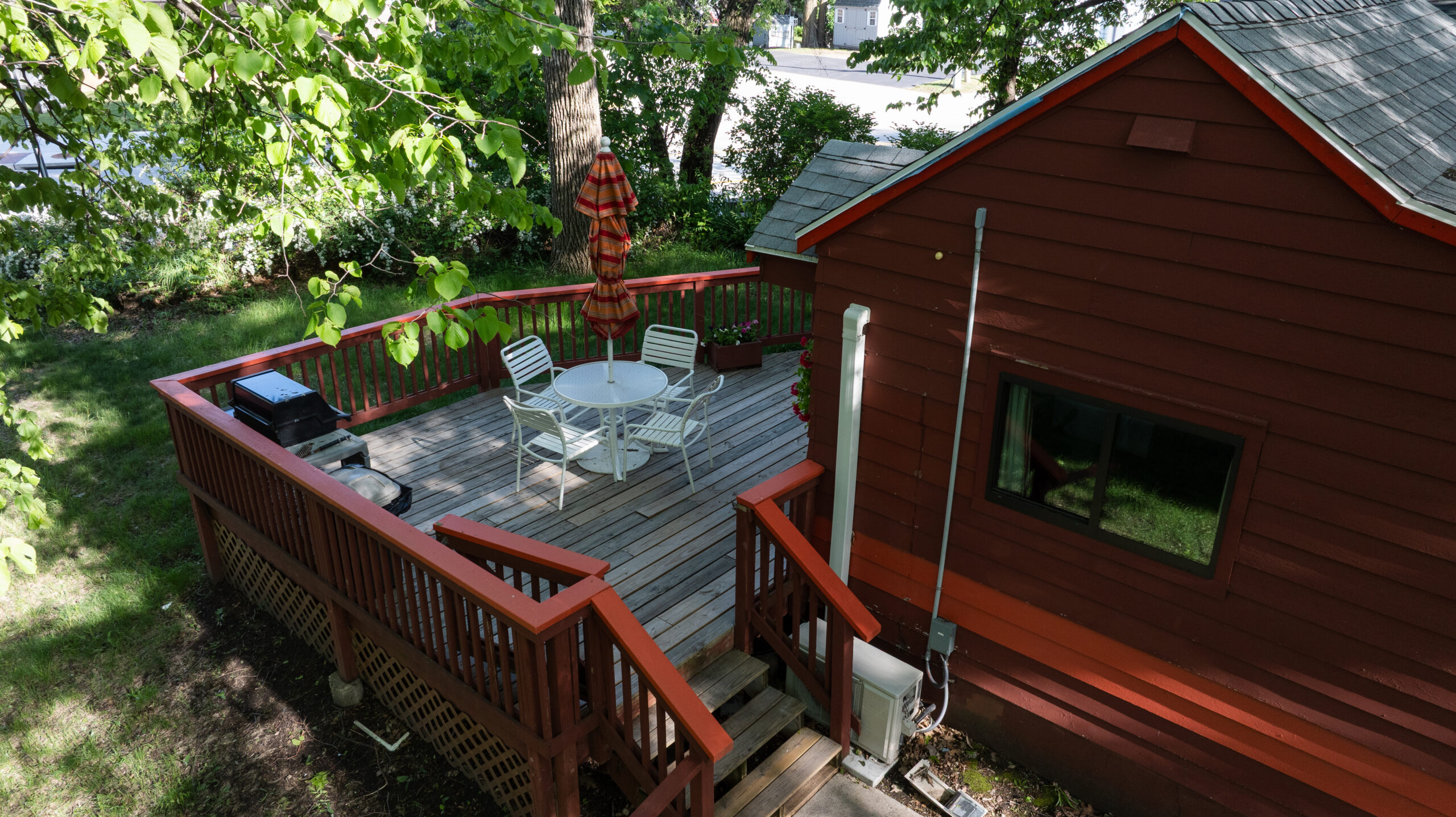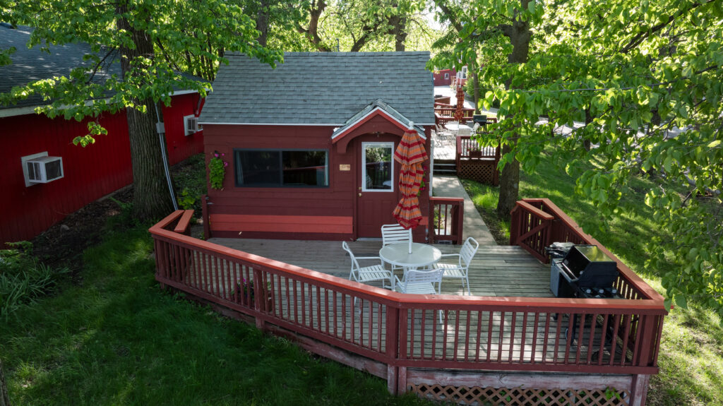This small cottage has one main room with a queen bed, sofa sleeper, and a kitchenette equipped with a two-burner cooktop, a half-sized refrigerator, and a deck.