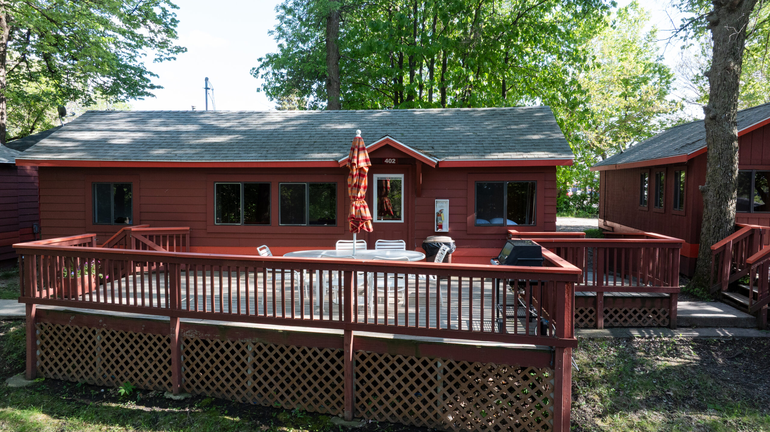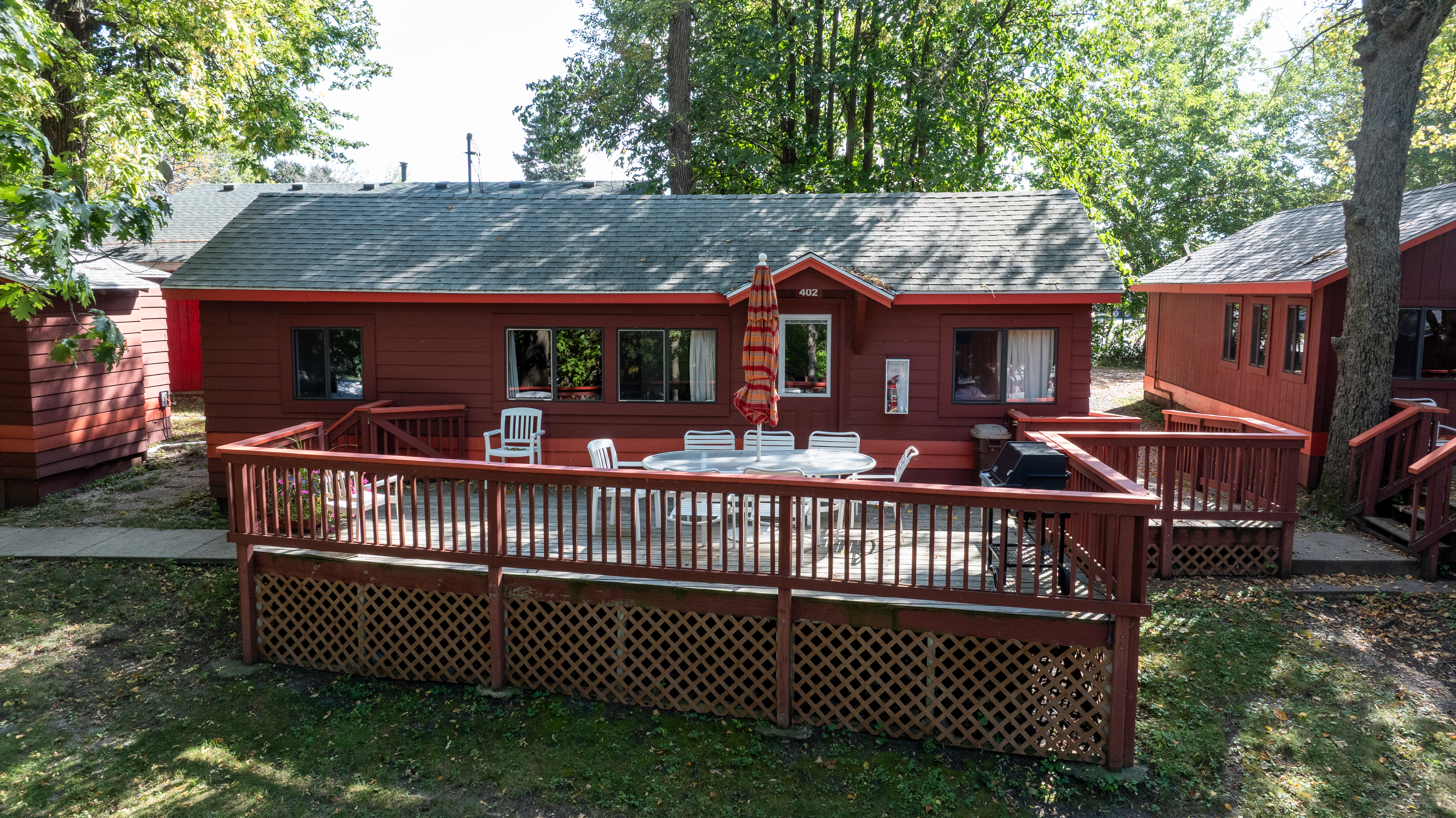 This cottage has two bedrooms with a queen bed in each, as well as a sofa sleeper in the main room. The full kitchen is equipped with a dishwasher. The deck overlooks the outdoor pool.