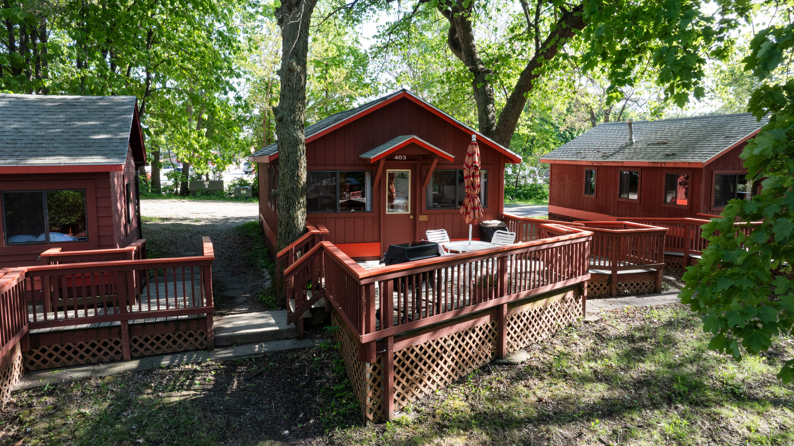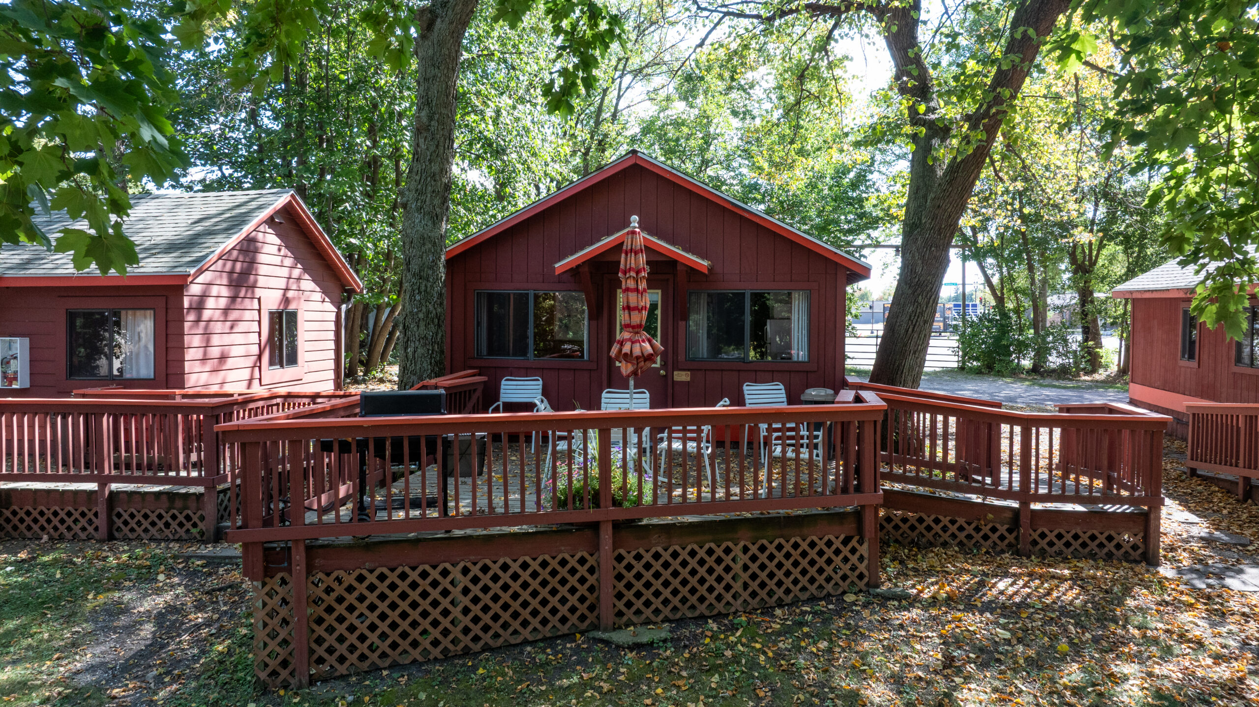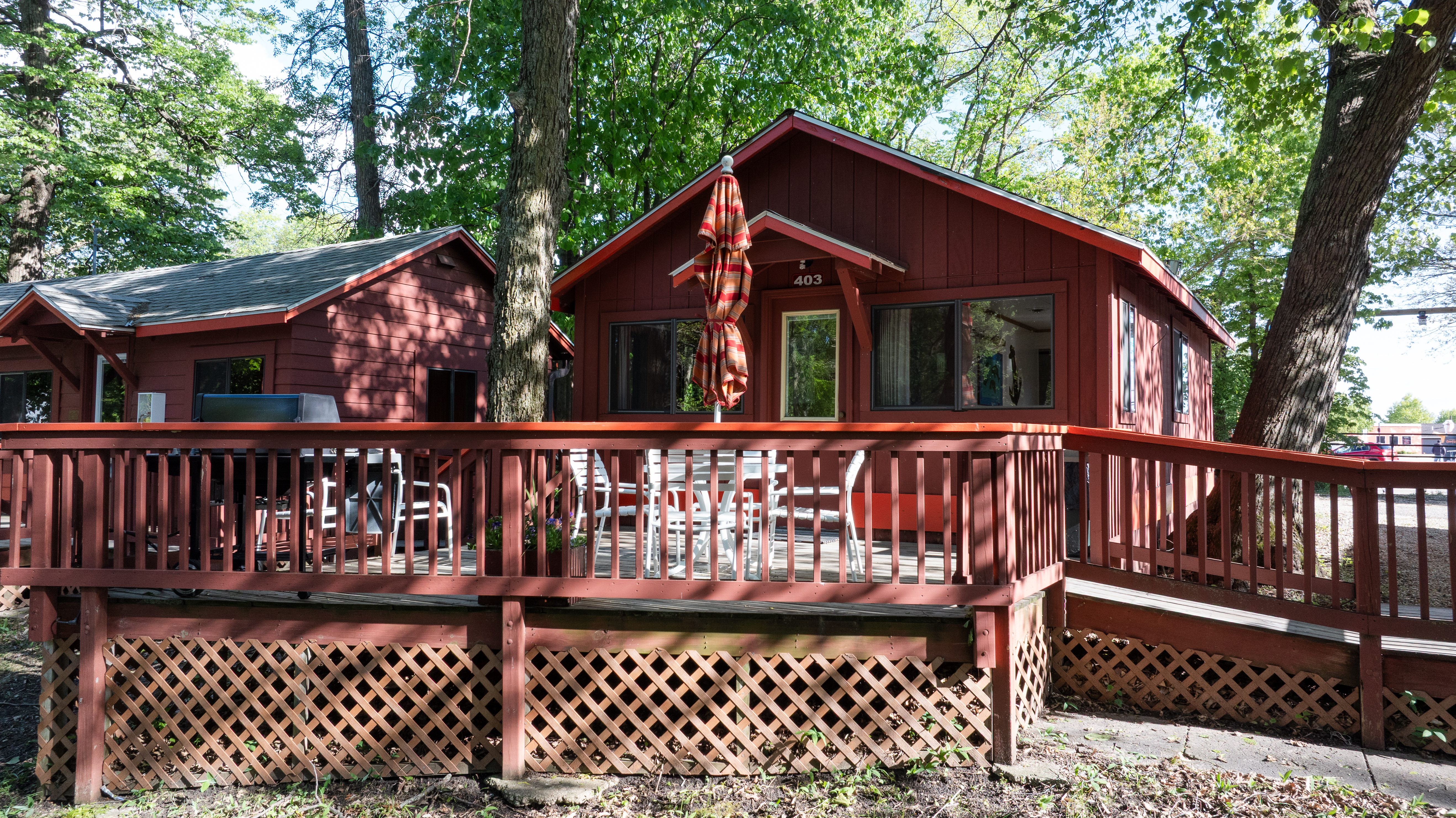 This cottage has a bedroom with a queen bed and a sofa sleeper in the living area. The full kitchen is equipped with a dishwasher. The deck overlooks the outdoor pool.