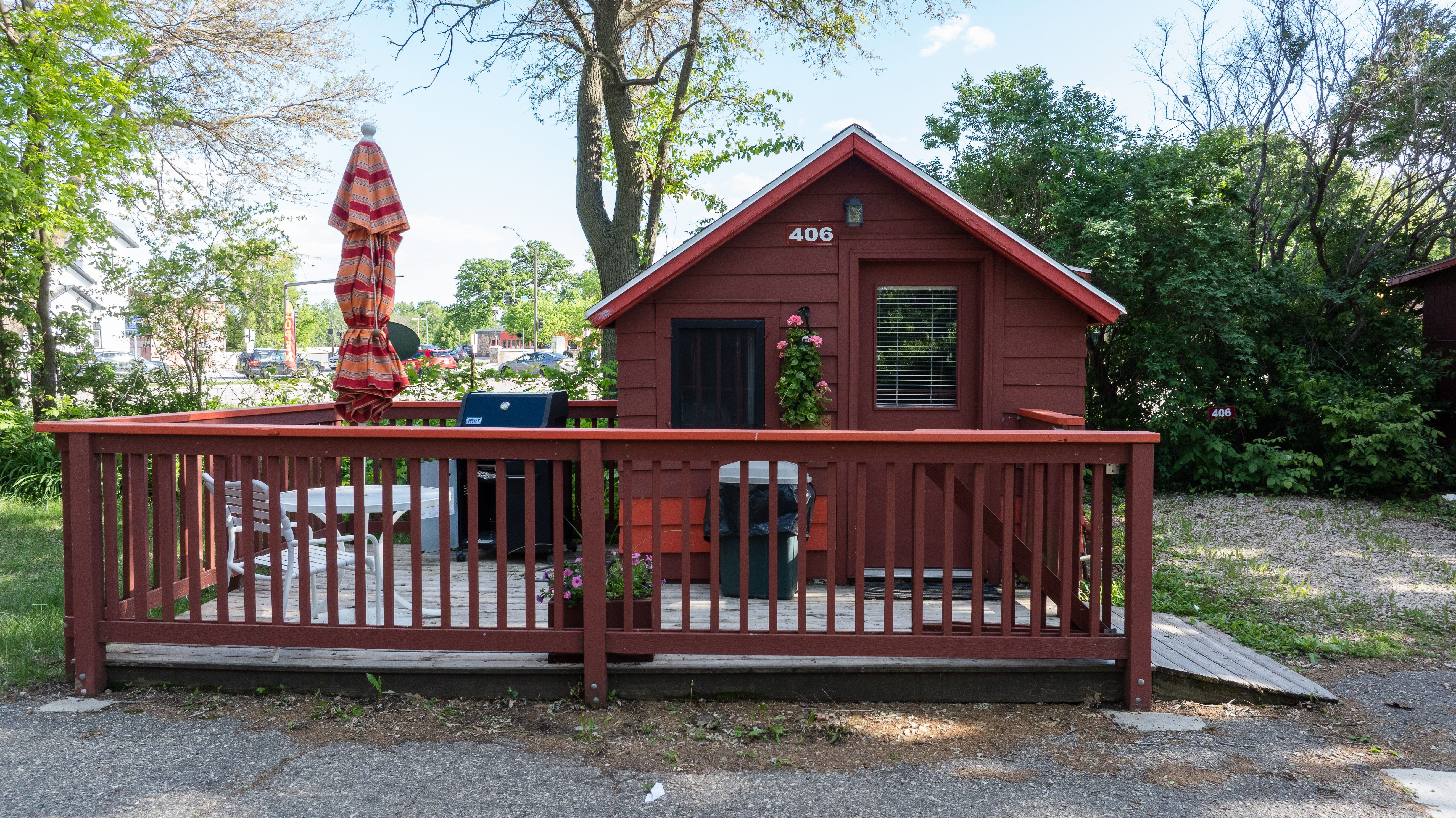 This small cottage has one main room with a queen bed and a kitchenette equipped with a half-sized refrigerator and a two-burner cooktop. There is a deck with a table, chairs and a gas grill.