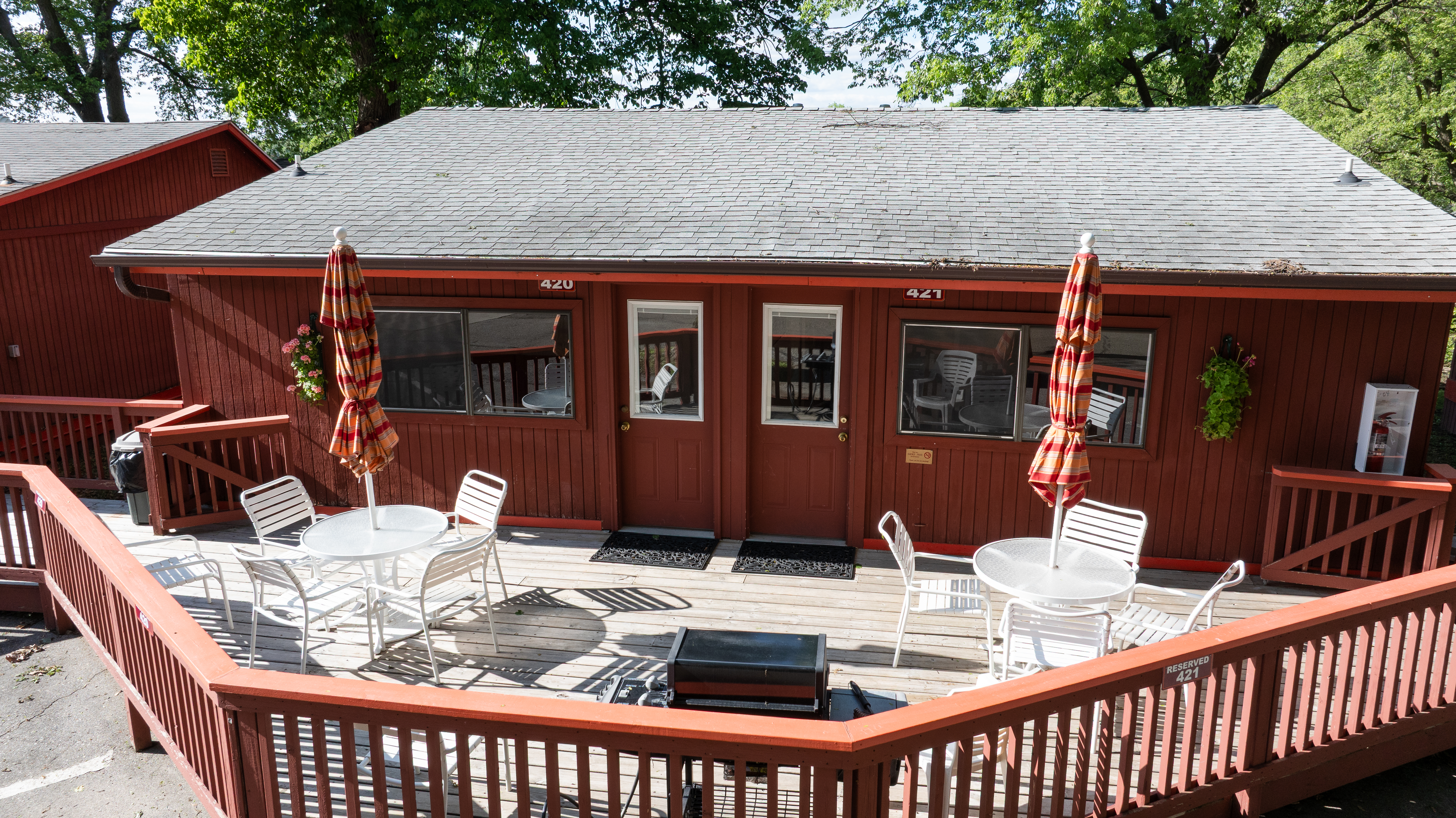 These units are a duplex. Each has a bedroom with two queen beds. A sofa sleeper, a full kitchen with dishwasher, and a dining table are in the main room. These units share a deck and a gas grill that overlook the outdoor pool area.