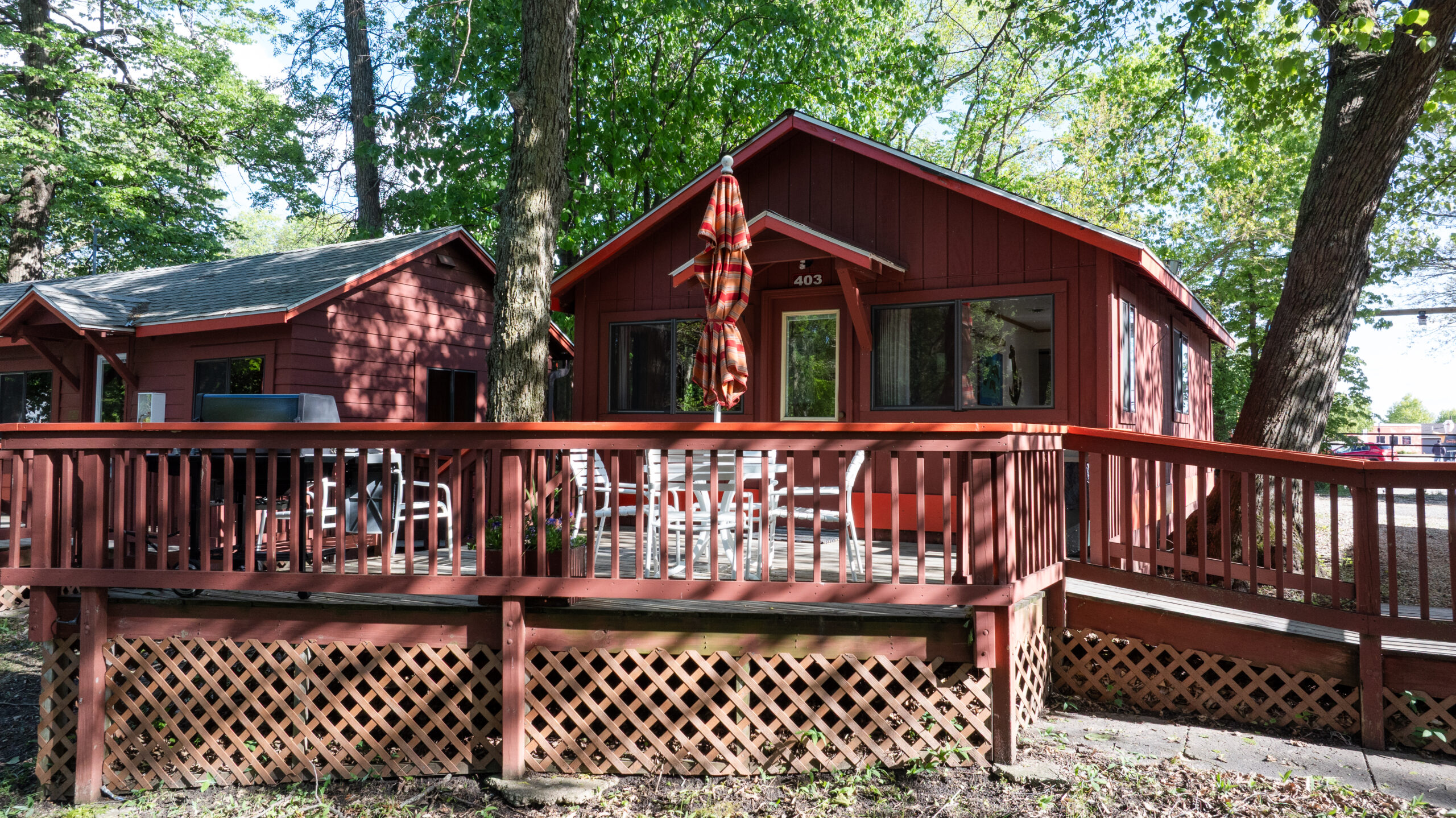 These cottages have two bedrooms with a queen bed in each. A sofa sleeper, a queen bed, dining table, and a kitchen with dishwasher are in the main room. There is one bathroom and a deck with gas grill that overlooks the outdoor pool and picnic area.