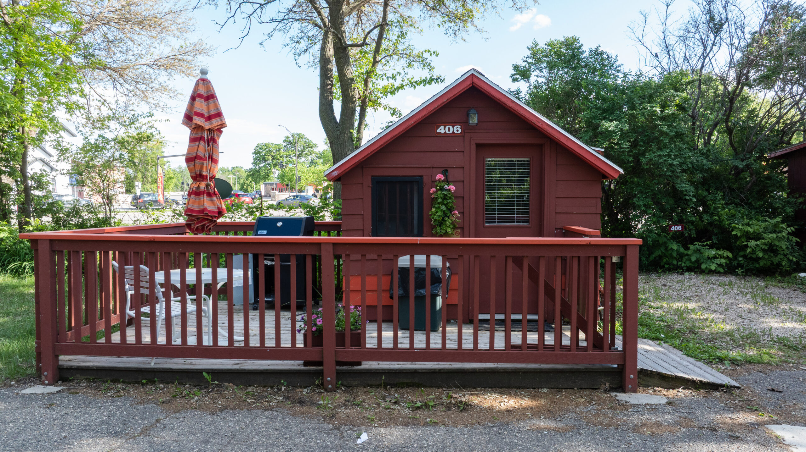 This cottage is located on the upper side of the Cottage Colony. It has one bedroom with a queen bed and a sofa sleeper in the main room with the full kitchen. There is a deck with patio table, chairs, and a gas grill that overlooks the outdoor pool.