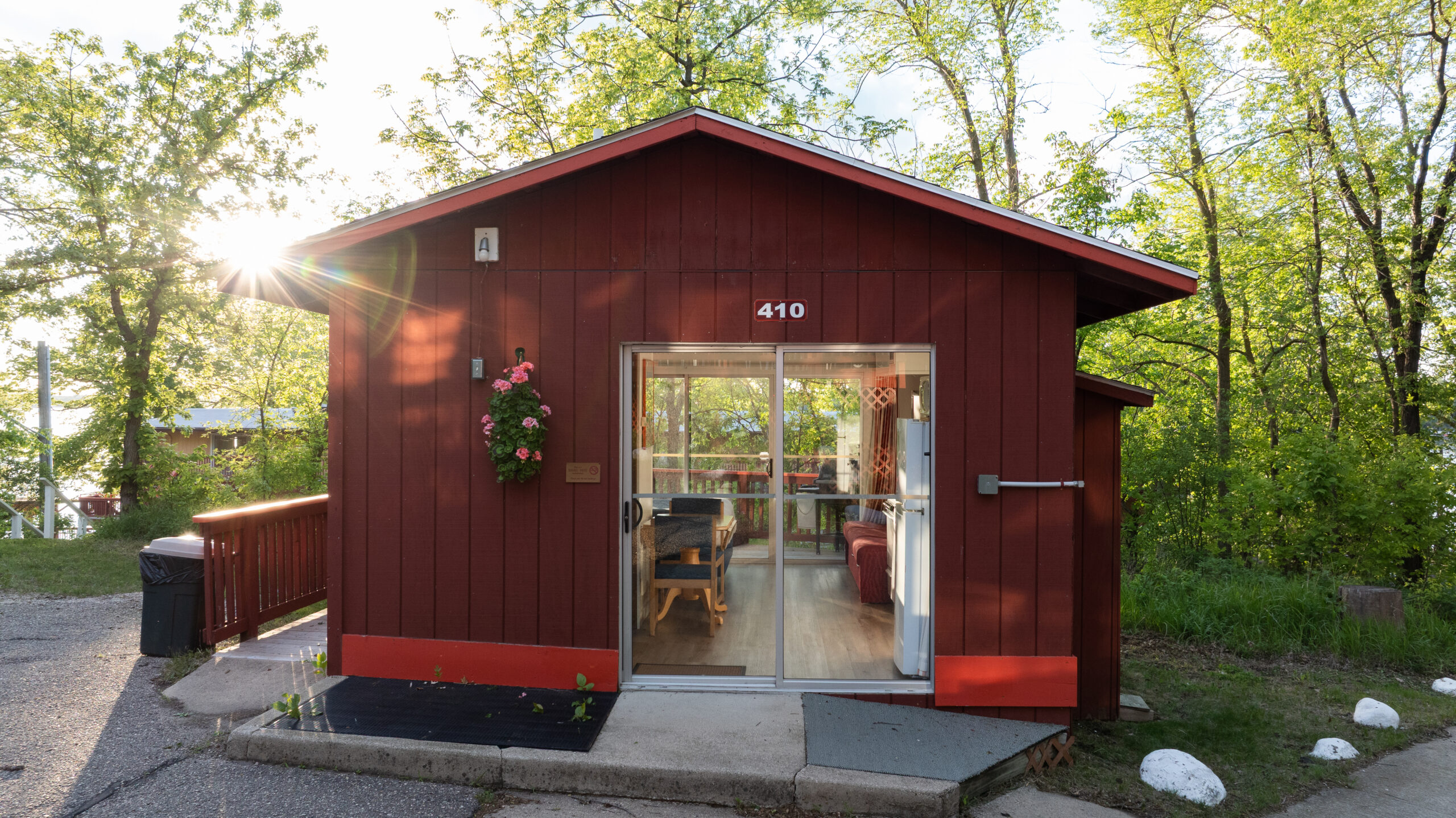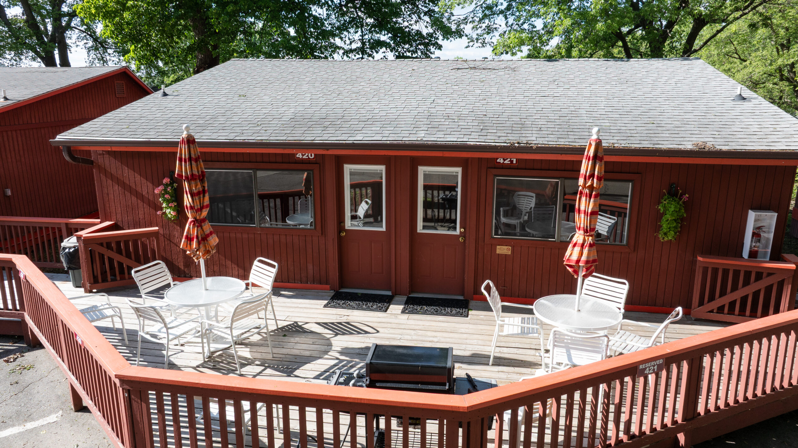 Treetop Apartments 426 and 427 are located on the top floor of a two-story building along US-71 that adjoins Cottage Colony at the back door. Each apartment has a bedroom with a queen bed and a sofa sleeper in the living room. They also feature flat-screen TVs, wood or tiled floors, a breakfast nook, and a full kitchen. Downstairs there is a shared patio with outdoor dining and share gas grills. These apartments have a steep stairway and are not recommended for children under 12 years.