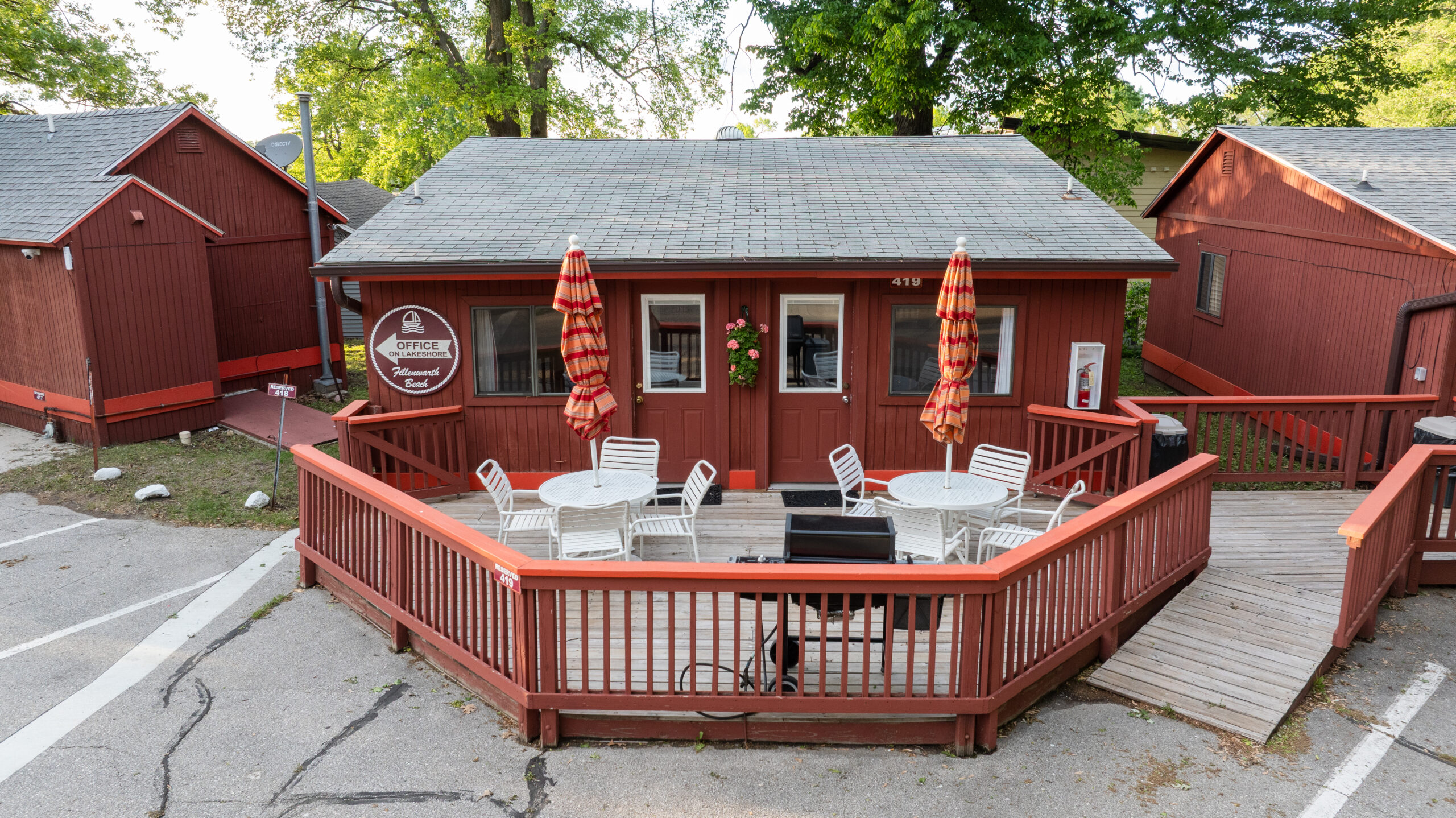 Cottage 422 has two bedrooms with a queen bed, a living/dining room with a queen bed and sofa sleeper, a full kitchen with dishwasher, and one bathroom. Off the front of the unit is a deck with patio table, chairs, a gas grill, and a view of the outdoor pool and picnic area.